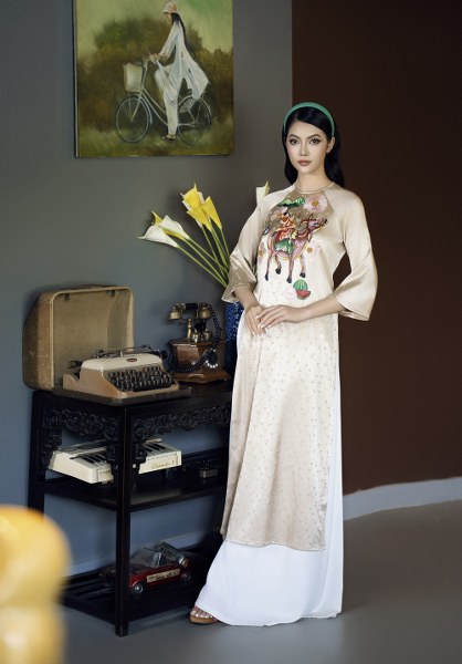 Về chất liệu, NTK đã chọn lựa sự kết hợp giữa lụa Nhật Bản và lụa Việt Nam vừa đảm bảo sự thoải mái khi mặc vừa tôn lên vóc dáng người phụ nữ Việt.