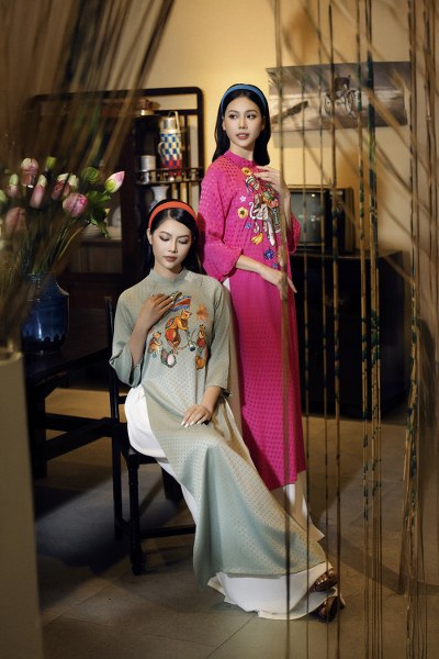 Nhà thiết kế Võ Việt Chung ra mắt BST áo dài "Bức tranh mùa xuân" với 10 thiết kế độc đáo lấy cảm hứng từ tranh Đông Hồ được trình diễn bởi hai nàng hậu Thu Uyên và Bùi Quỳnh Hoa.
