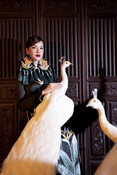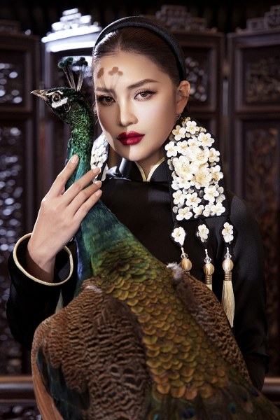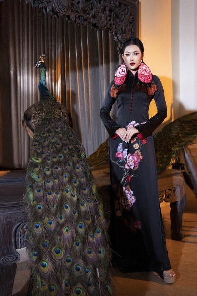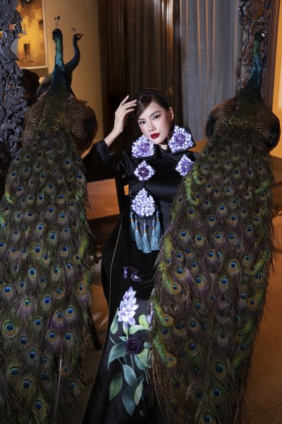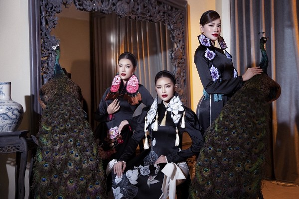 Họa tiết hoa, lá và chim trên thân áo được thực hiện thủ công với kỹ thuật vẽ trang trí, đính kết và thêu tay, tạo hiệu ứng 3D sinh động. Mỗi bộ áo dài còn được phối hợp kỹ lưỡng với phụ kiện như băng đô cài đầu và hoa tai tua rua, tất cả đều được chế tác thủ công trong hơn 30 ngày.