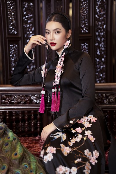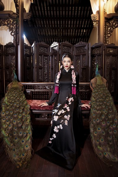 Trong bộ sưu tập này, sắc đen nguyên bản của Lãnh Mỹ A được giữ nguyên, điểm xuyết những gam màu nổi bật như trắng, đỏ, hồng, vàng, tím qua các họa tiết trên thân áo. Phom dáng vẫn giữ nét đặc trưng của áo dài truyền thống nhưng được cách tân phù hợp với cuộc sống đương đại với chi tiết tay phồng, cổ tròn, đính nơ.