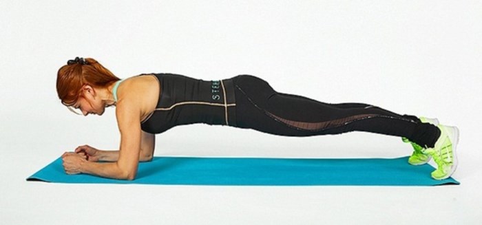 1A. Nằm sấp, giữ thăng bằng cho cơ thể bằng 2 cẳng tay và đầu các ngón chân, lưng giữ thẳng. Thót bụng để phần mỡ bụng không bị chảy xuống.