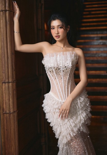 Á hậu Phương Nhi diện những thiết kế lộng lẫy, được lồng ghép họa tiết thời Phục hưng thông qua các đính kết. Hàng nghìn viên pha lê nhiều kích cỡ từ 3mm-8mm được ứng dụng linh hoạt, bắt mắt.