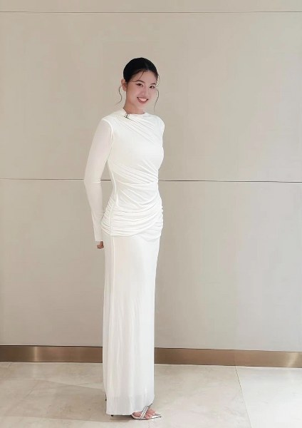 Tại một sự kiện ở TPHCM, Ánh Viên diện đầm trắng xếp nếp lấy cảm hứng từ Hy Lạp cổ đại. Thiết kế dáng cột giúp tạo hiệu ứng cao ráo, được cô phối ăn ý sandals cao gót màu bạc.