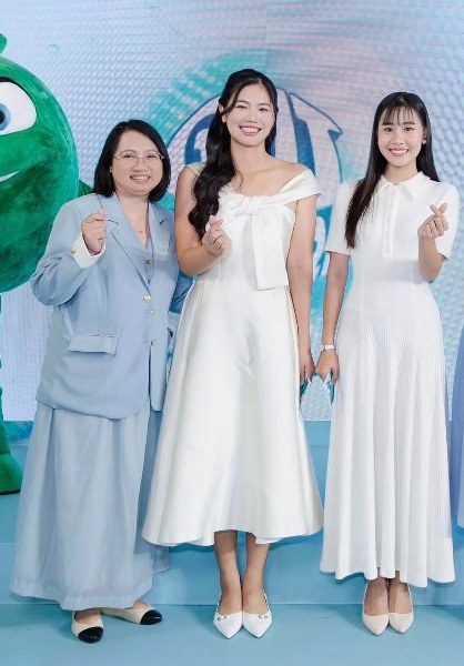 Ở một sự kiện khác, Ánh Viên chọn đầm trắng chữ A trễ vai, kết hợp giày mũi nhọn. Cô tô điểm cho gương mặt bằng kiểu tóc xoăn nhẹ chải lệch bên, son môi bóng hồng.