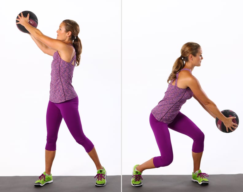 - Đứng thẳng, hai chân mở rộng bằng vai, cầm bóng tập hoặc tạ nhẹ ở một bên vai.