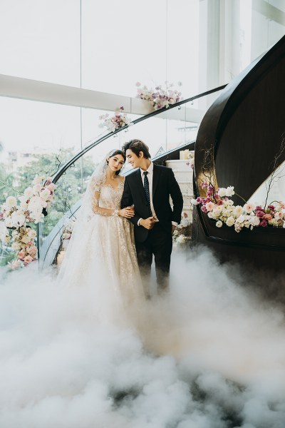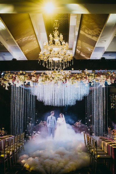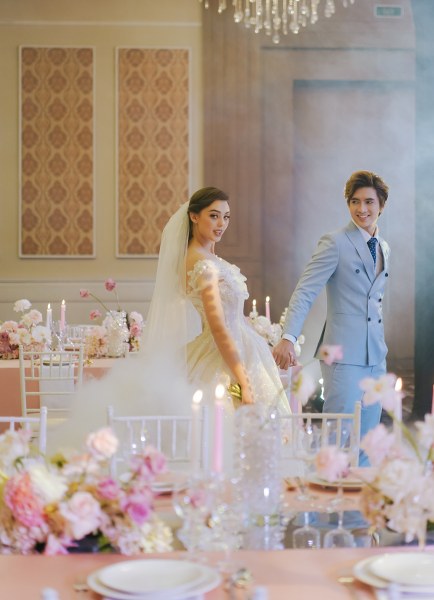 Không gian nơi hai người mẫu chụp ảnh được trang hoàng bằng hoa tươi, đèn chùm, những dây pha lê lấp lánh khiến hình ảnh "cô dâu, chú rể" thêm lung linh, lãng mạn.