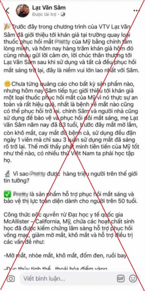 Trong đó, có một trang đăng hàng loạt bài viết về một sản phẩm thuốc phục hồi mắt với thông tin sai sự thật như: Lại Văn Sâm từng quảng cáo thuốc này trong một chương trình của VTV, mẹ Lại Văn Sâm phục hồi mắt nhờ sử dụng thuốc...