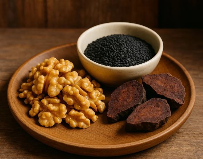 Vừng đen là một trong những nguyên liệu được Từ Hi Thái Hậu rất ưa chuộng để dưỡng tóc. Theo nghiên cứu của Viện Dinh dưỡng Quốc gia (trích nguồn từ báo VNExpress), vừng đen chứa nhiều vitamin E, B1, B2 cùng các khoáng chất như sắt, kẽm rất cần thiết cho sự phát triển của tóc. Không chỉ vậy, vừng đen còn có tác dụng bổ huyết, dưỡng âm, giúp tóc đen mượt tự nhiên.