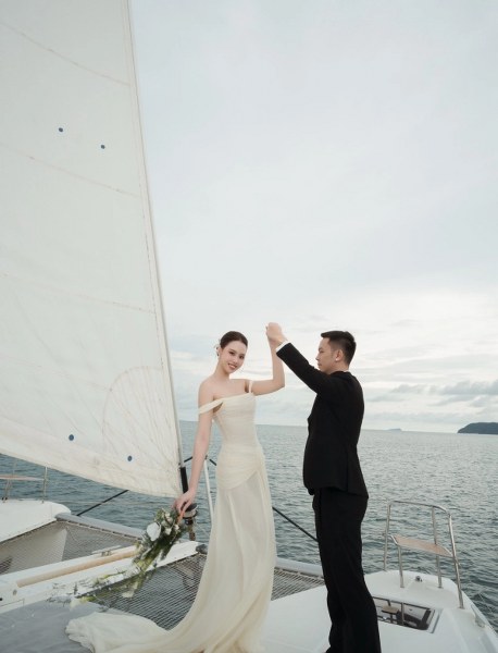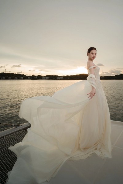 Tâm Như diện váy cưới lụa tôn vai trần, cùng chồng khiêu vũ trên du thuyền.