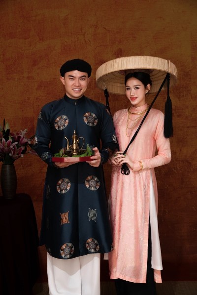 Doanh nhân Viết Vương đội khăn xếp, diện áo dài mang các biểu tượng của trường thọ, may mắn, bưng đĩa đựng trà và trầu cau.