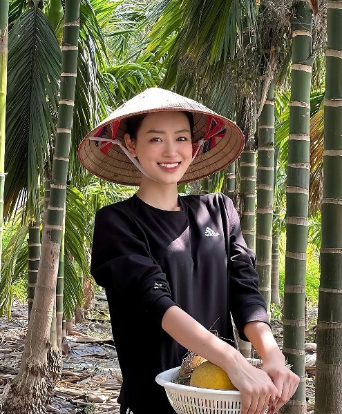 Người đẹp đang theo đuổi các dự án về nông nghiệp sạch nên thường xuyên ra vườn tìm hiểu và thu hoạch. Sinh ra, lớn lên ở nơi gắn liền nghề nông, cô cho biết chọn học ngành quản trị kinh doanh nông nghiệp vì muốn giúp bà con làm giàu từ nông phẩm, tạo hướng đi bền vững cho tương lai.
