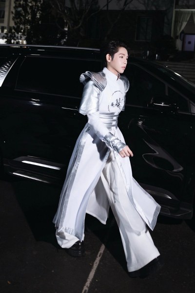 Trên nhiều sân khấu, Đức Phúc chọn áo dài khi biểu diễn "Phù Đổng Thiên Vương" - ca khúc từng giúp anh chiến thắng cuộc thi âm nhạc quốc tế. Nhạc phẩm do Hồ Hoài Anh sáng tác, một phần lấy cảm hứng từ truyền thuyết Thánh Gióng cưỡi ngựa bay về trời.