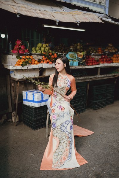 Cô diện áo dài họa tiết hoa lá của nhà thiết kế Võ Việt Chung, du xuân sớm tại nhiều địa điểm nổi tiếng của TPHCM. Hà Thanh Xuân dạo chợ, ôn lại kỷ niệm tuổi thơ khi cùng mẹ đi sắm sửa Tết.