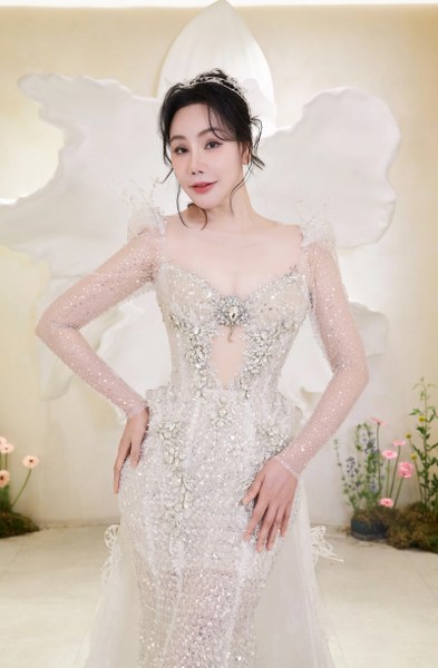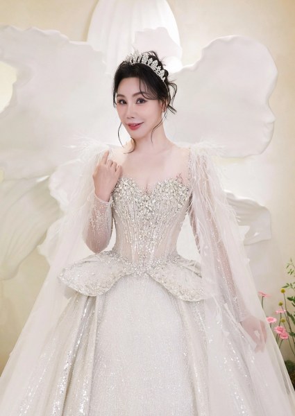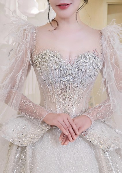 Khi lên lễ đường, ca sĩ diện đầm công chúa với thân trên dáng peplum, thân váy đính sequin và 10.000 viên pha lê swarovski tạo hiệu ứng bắt sáng. Phần ống tay làm từ vải tulle xuyên thấu, đính lông vũ thể hiện nét vương giả. Cô dâu đội khăn voan thêu tên riêng - món quà Linh Nga dành cho cô như một lời chúc phúc cho chuyện tình viên mãn.