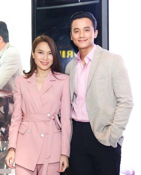 Tại một sự kiện, ca sĩ diện bộ suit hồng phấn dáng quấn, thiết kế thắt eo giúp tôn dáng. Trong khi đó, Mai Tài Phến phối blazer tông be sáng cùng sơ mi hồng nhạt, kết hợp quần tối màu.