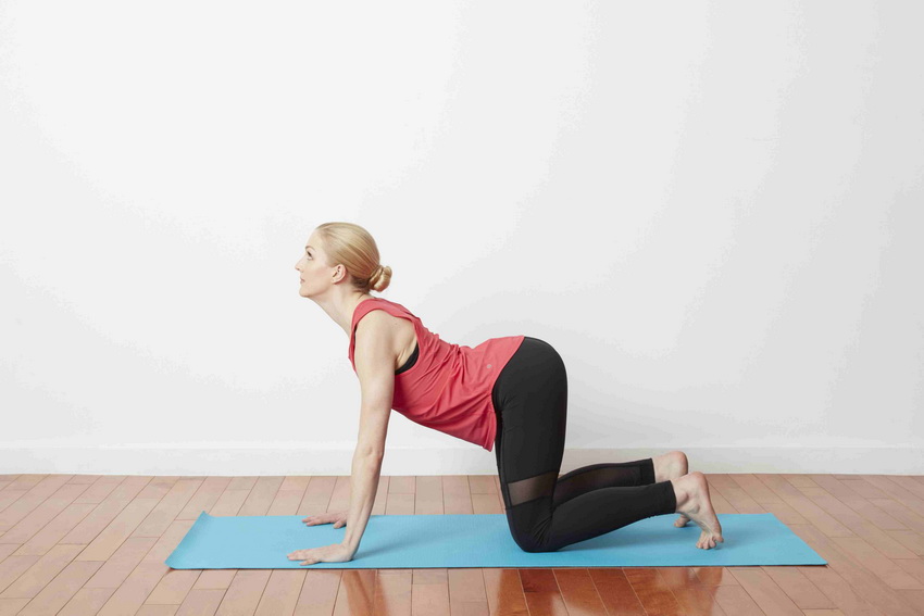 - Hít vào và chuyển sang tư thế Bò. Hóp bụng về phía thảm, nâng cằm và ngực lên. Nhìn lên trần nhà. Mở rộng ngực và vai của bạn. Tạm dừng trong vài giây.