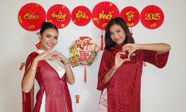 Từ trái qua gồm Á hậu Karnruethai Tassabut, Miss Cosmo - Ketut Permata Juliastrid, Kim Duyên, Ngọc Châu, Hoàng Nhung, Xuân Hạnh trong bộ ảnh đón năm mới Ất Tỵ.