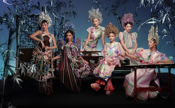 Họ diện trang phục thuộc bộ sưu tập Ru - Hò xự xang xê cống của nhà thiết kế Thủy Nguyễn.