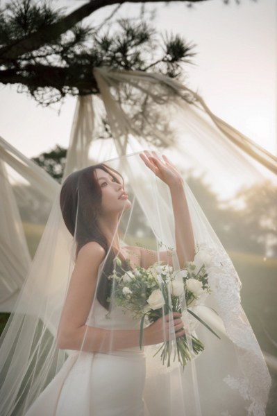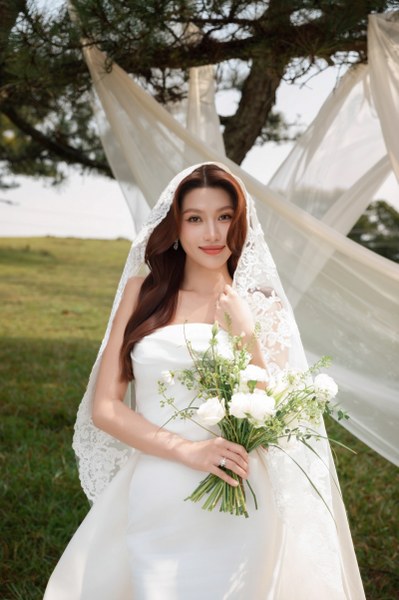 Quỳnh Châu trang điểm phong cách nhẹ nhàng. Người đẹp diện áo cưới của nhà thiết kế Chung Thanh Phong với phần tà xòe rộng, khăn voan ren trùm đầu.