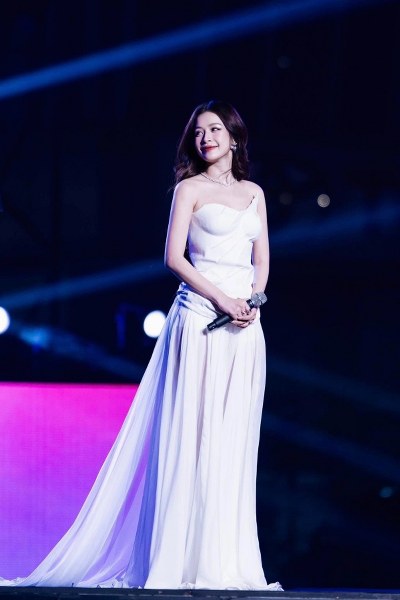 Chi Pu diện đầm Lê Thanh Hòa trong một chương trình tại Trung Quốc tháng 3. Thiết kế dáng chữ A, quây ngực phù hợp với chiều cao, bờ vai nhỏ của ca sĩ, giúp cô ghi điểm trước khán giả.