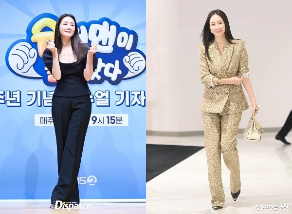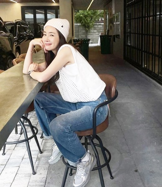 "Nữ hoàng nước mắt" Choi Ji Woo hướng đến phong cách năng động với áo thun, quần jeans, mũ lưỡi trai ở tuổi 50.