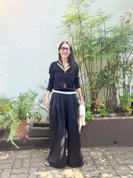 Cô ghi điểm phong cách với dáng áo cape, quần denim xắn gấu, giày thể thao và túi xách dáng cổ điển. Ji Woo nhiều lần nói yêu màu đen vì tôn da trắng, vóc dáng trông gọn hơn.
