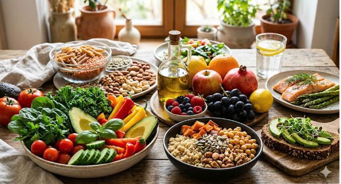Thành phần chính: Tập trung vào các loại chất béo lành mạnh (dầu ô liu), protein từ cá, các loại hạt, ngũ cốc nguyên hạt, trái cây và rau củ.