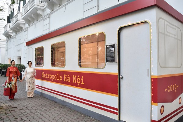 Điểm dừng chân đầu tiên trong hành trình tham quan chợ Tết năm nay tại khách sạn Metropole Hà Nội là "trạm" tàu điện nằm trên phố Lê Phụng Hiểu, mô phỏng theo hình ảnh chiếc tàu điện xưa