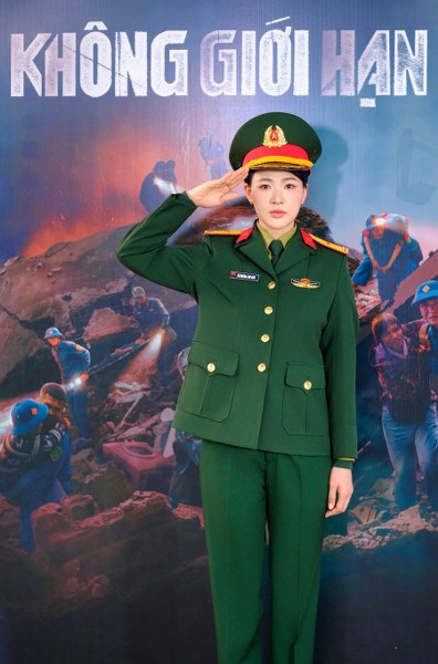 Minh Trang trong bộ quân phục ngày ra mắt phim. Cô nói, đây là bộ trang phục đẹp nhất mình từng mặc. Lam Anh cũng là vai nữ chính của Minh Trang trên phim giờ vàng VTV.