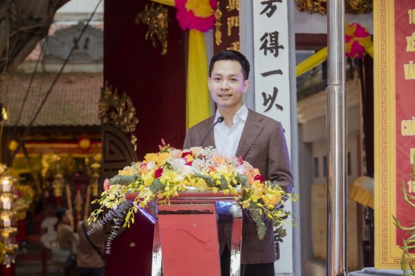 Ông Lê Minh Đức – Chủ tịch UBND phường Hàng Bồ phát biểu khai mạc Lễ dâng hương tưởng niệm Hoá nhật Đức Thánh tổ Huyền Thiên Thượng đế - Kỷ niệm 10 năm đón nhận bằng xếp hạng di tích lịch sử văn hoá Đình Đông Thành