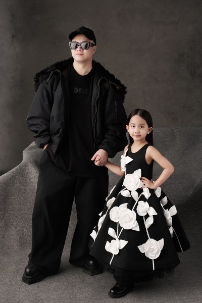 Các bé trai diện đồ cơ bản, tối giản giống bố, bé gái diện các bộ váy hoa 3D được bố làm lại từ bản gốc được yêu thích trong bộ sưu tập dành cho người lớn.