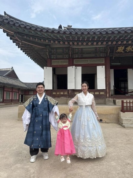 Gia đình hoa hậu du lịch Hàn Quốc năm 2025, trải nghiệm mặc hanbok. Mỗi năm, cô lên kế hoạch đi du lịch, cho con gái làm quen với nhiều môi trường để dạn dĩ hơn.