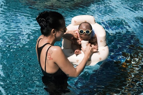 Ngô Thanh Vân cho con ngồi ghế hơi trong hồ bơi. Cuối tuần, cô và Huy Trần thường đưa con đi du lịch gần TP HCM để thay đổi không khí, học cách sống chậm.