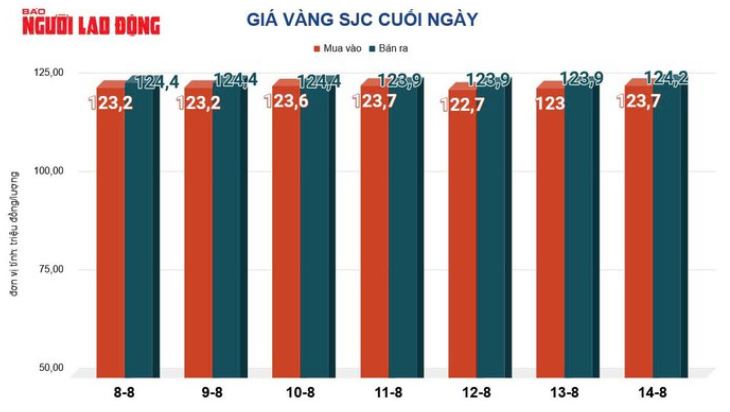 Tại Việt Nam, vào cuối ngày 14-8, giá vàng SJC được bán ra ở mức 124,2 triệu đồng/lượng, trong khi giá vàng nhẫn ở mức 119,3 triệu đồng/lượng.