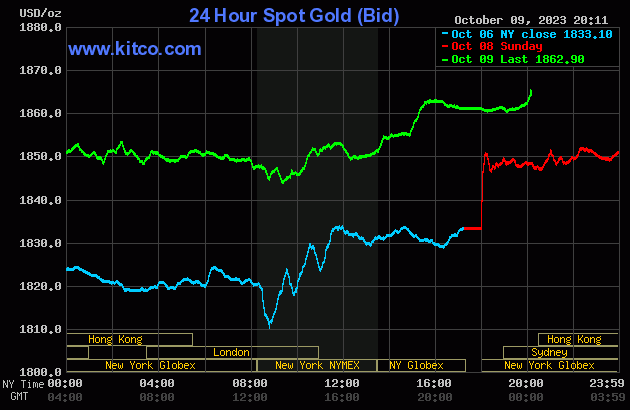 Giá vàng tăng cao sau thông tin bất ổn giữa Hamas vào Israel. Giá vàng giao kỳ hạn tháng 12 tăng 21,2 USD ở mức 1866,2 USD/ounce.