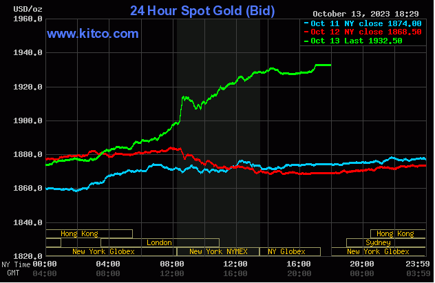 Giá vàng thế giới trên sàn Kitco khép phiên giao dịch cuối tuần ở mức 1932.5 - 1933.5 USD/ounce. Trong phiên, giá vàng dao động trong khoảng 1873.2 - 1933.8 USD/ounce.