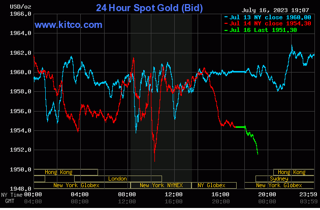 Giá vàng hôm nay ngày 17/7/2023 ghi nhận giảm nhẹ đầu phiên, giao dịch đầu tuần ở mức 1952.1 - 1953.1 USD/ounce.
