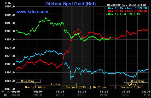 Giá vàng thế giới trên sàn Kitco khép lại phiên giao dịch cuối tuần ở mức 1981.1 - 1982.1 USD/ounce. Trong phiên, kim loại quý giao dịch trong khoảng giá 1978.1 - 1994.3 USD/ounce.