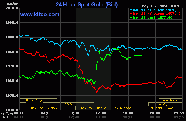 Giá vàng thế giới trên sàn Kitco khép phiên giao dịch cuối tuần ở mức 1977.6 - 1978.6 USD/ounce. Trong phiên, giá vàng dao động trong khoảng 1956.9 - 1985.5 USD/ounce.