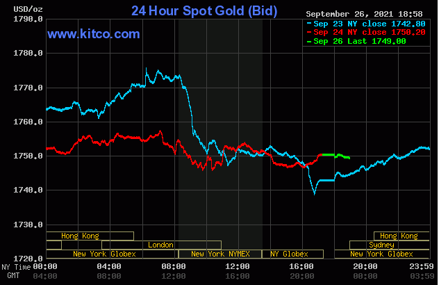 Giá vàng thế giới trên sàn Kitco giao dịch ở mức 1749.5 – 1750.5 USD/ounce. Giá vàng tương lai giao tháng 10 trên sàn Comex New York tăng 1 USD lên 1.748,7 USD/ounce.