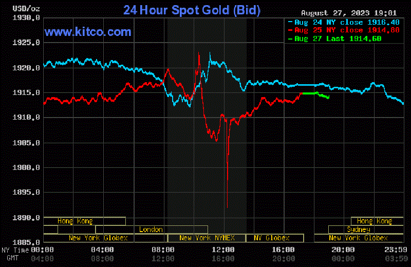 Giá vàng thế giới trên sàn Kitco mở giao dịch đầu tuần ở mức 1914 - 1915 USD/ounce. Trong phiên cuối tuần, giá vàng dao động trong khoảng 1913.8 - 1916.2 USD/ounce.
