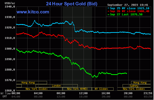 Giá vàng thế giới trên sàn Kitco mở phiên giao dịch ở mức 1876.4 - 1877.4 USD/ounce. Trong phiên trước, giá vàng dao động trong khoảng 1872 - 1900.6 USD/ounce.