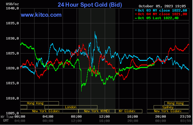 Giá vàng thế giới trên sàn Kitco mở phiên giao dịch ở mức 1821 - 1822 USD/ounce. Trong phiên trước, giá vàng dao động trong khoảng 1811.9 - 1829.7 USD/ounce.