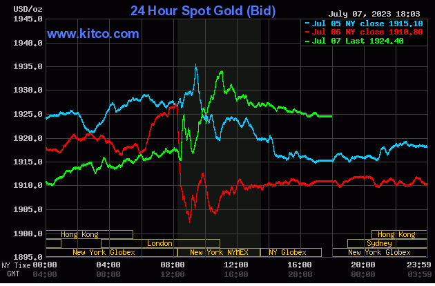 Giá vàng thế giới trên sàn Kitco khép phiên giao dịch cuối tuần ở mức 1924.4 - 1925.4 USD/ounce. Trong phiên, giá vàng dao động trong khoảng 1909.8 - 1935.8 USD/ounce.