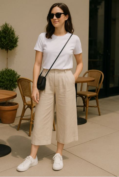 Quần culottes hoặc quần ống rộng là lựa chọn tuyệt vời cho mùa hè nhờ khả năng thoáng khí và thoải mái. Bạn có thể chọn chất liệu linen hoặc cotton để tăng độ mát mẻ. Kết hợp cùng áo thun hoặc sơ mi trắng, đây sẽ là outfit lý tưởng cho cả đi làm lẫn dạo phố.