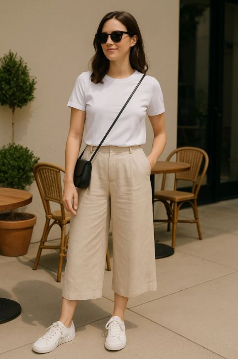 Quần culottes hoặc quần ống rộng là lựa chọn tuyệt vời cho mùa hè nhờ khả năng thoáng khí và thoải mái. Bạn có thể chọn chất liệu linen hoặc cotton để tăng độ mát mẻ. Kết hợp cùng áo thun hoặc sơ mi trắng, đây sẽ là outfit lý tưởng cho cả đi làm lẫn dạo phố.