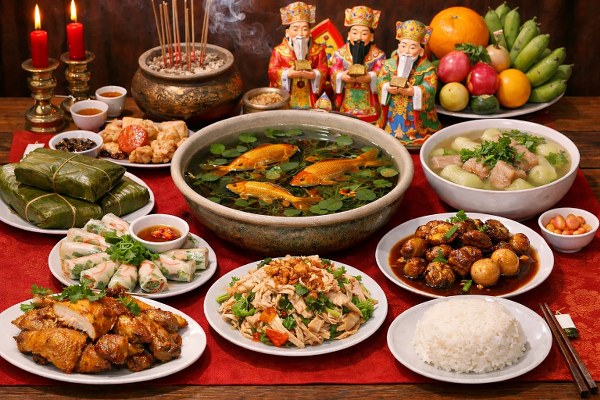 Một mâm cỗ mặn cúng ông Công, ông Táo thường gồm những món ăn quen thuộc trong dịp lễ Tết của người Việt: