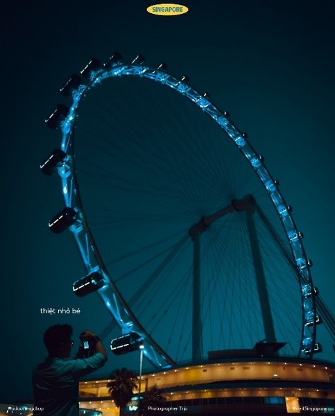 Vòng quay quan sát Singapore Flyer có chiều cao lên đến 165 mét, tương đương một tòa nhà 42 tầng. Từ khi đi vào hoạt động năm 2008, công trình kiến trúc này đã nhanh chóng trở thành điểm tham quan hút khách nhờ tầm nhìn toàn cảnh thành phố từ trên cao. Nếu muốn đặc tả trọn vẹn độ cao choáng ngợp của vòng quay, bạn có thể tham khảo góc chụp của Ở Đâu Cũng Chụp. Sự tương phản giữa dáng người nhỏ bé ở góc khung hình và vòng quay khổng lồ giữa màn đêm càng làm nổi bật vẻ đẹp hùng vĩ và ấn tượng của công trình này. (Ảnh: Ở đâu cũng chụp)