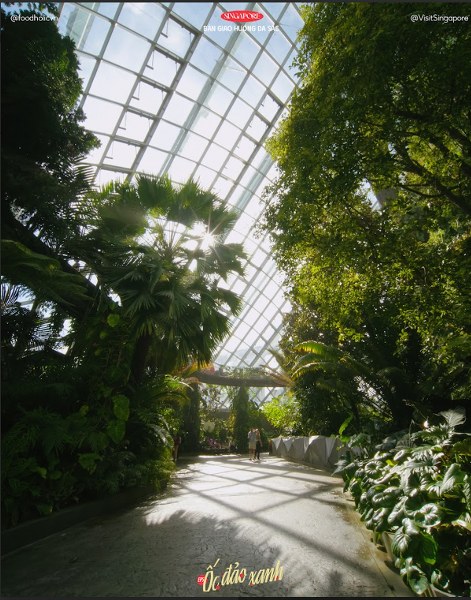 Công trình xanh Gardens by the Bay rộng đến 101 héc-ta, nằm bên vịnh Marina với ba khu vực chính gồm Bay South (Vịnh Nam), Bay East (Vịnh Bắc) và Bay Central (Vịnh Trung tâm). Trong đó nổi bật là khu vực Bay South, với các địa điểm tham quan nổi tiếng như Cloud Forest hay Flower Dome. Trong hình là khu nhà kính Cloud Forest được thiết kế để tái hiện thảm thực vật đặc trưng của các vùng cao nguyên nhiệt đới. Thác nước trong nhà cao vút, tầng cây xanh mờ ảo, ánh sáng xuyên qua tán lá, tất cả tạo nên khung cảnh siêu thực, vừa huyền ảo, vừa yên bình. (Ảnh: Foodholic.vn, Ở đâu cũng chụp)