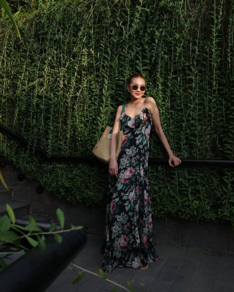 Trong chuyến đi Phú Quốc cùng chồng giữa tháng 5, Thanh Hằng chọn đầm maxi hoa vải lanh phối túi cói và dép lê. Cô tạo điểm nhấn cho gương mặt bằng kính râm gọng tròn theo phong cách hippie.